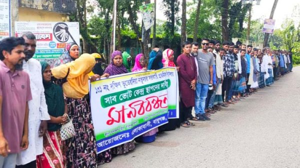 সাব ভোটকেন্দ্র স্থাপনের দাবিতে বাবুগঞ্জে মানববন্ধন ও নির্বাচন কর্মকর্তার কার্যালয় ঘেরাও