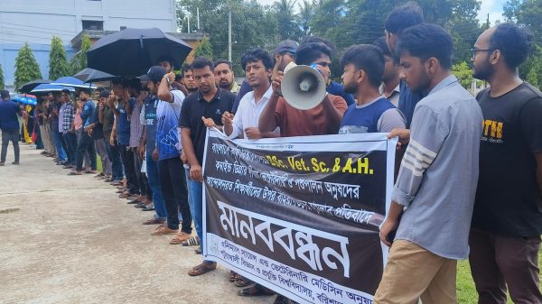 শিক্ষার্থীদের উপর হামলার প্রতিবাদে বরিশাল ক্যাম্পাসে শিক্ষার্থীদের মানববন্ধন