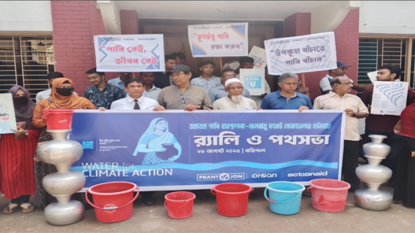 নিজস্ব প্রতিবেদক,বরিশাল: “উপকূল বাঁচাতে পানি বাঁচান” এই স্লোগানে বরিশালে বিশ্ব পানি সপ্তাহ-২০২৫ উপলক্ষ্যে বরিশালে পথসভা করেছে বেসরকারি বিভিন্ন উন্নয়ন সংস্থা। প্রান্তজন ও পার্টিসিপেটরি রিসার্চ অ্যাকশন নেটওয়ার্ক (প্রাণ) এর আয়োজনে