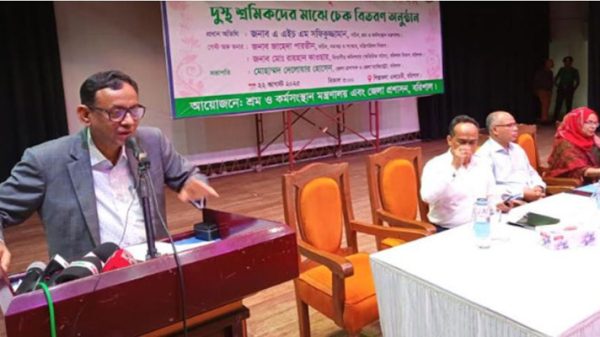 নিজস্ব প্রতিবেদক,বরিশাল: বরিশালে শিশু শ্রম নিরসনে তারুণ্যের ভূমিকা বিষয়ক কর্মশালা এবং দুস্থ শ্রমিকদের মাঝে চেক বিতরণ অনুষ্ঠান অনুষ্ঠিত হয়েছে।   শুক্রবার (২২ আগস্ট) বিকেলে শ্রম ও কর্মসংস্থান মন্ত্রণালয় এবং জেলা
