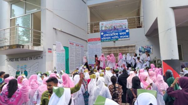নিজস্ব প্রতিবেদক// তিন শিক্ষককে অ্যাকাডেমিক ও প্রশাসনিক কার্যক্রম থেকে আজীবনের জন্য বিরত রাখার পাশাপাশি বিভিন্ন দাবিতে বিক্ষোভ করেছেন বরিশাল নার্সিং কলেজের শিক্ষার্থীরা। রোববার (৭ সেপ্টেম্বর) সকাল থেকে দুপুর পর্যন্ত