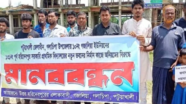 সঞ্জিব দাস,গলাচিপা // পটুয়াখালীর গলাচিপার গজালিয়া ইউপির ১৩১ নম্বর পূর্ব হরিদেবপুর সরকারি প্রাথমিক বিদ্যালয়ের নির্মণাধীন নতুন ভবনের কাজে অনিয়ম ও দুর্নীতির প্রতিবাদে মানববন্ধন কর্মসূচী পালিত হয়েছে। বুধবার (২৩ জুলাই) বেলা