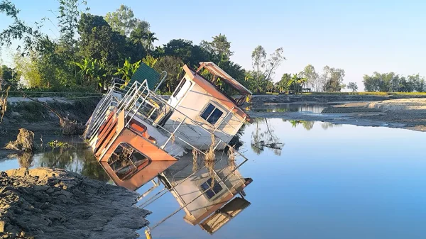 টেকসই বেড়িবাঁধের দাবিতে পাথরঘাটায় নদীর পারে মানববন্ধন