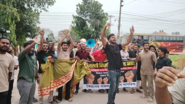 নিজস্ব প্রতিবেদক, বরিশাল: কিশোরগঞ্জের ভৈরবে অহরহ ছিনতাইয়ে অতিষ্ঠ হয়ে শাড়ি-চুড়ি নিয়ে থানায় হাজির হয়েছেন শতাধিক ছাত্র ও যুবসমাজের নেতাকর্মীরা। শনিবার (০২ আগস্ট) বিকেল সাড়ে ৪টার দিকে ছিনতাইবিরোধী যুবসমাজের ব্যানারে বিক্ষোভ