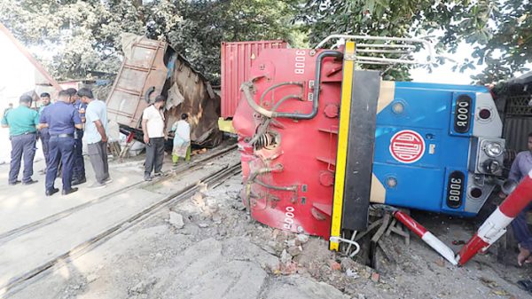 নিজস্ব প্রতিবেদক :রেললাইনে ঢুকে একটি চলন্ত ট্রেনের ইঞ্জিনে ধাক্কা দেয় একটি পণ্যবোঝাই লরি। এ সময় একটি বগিসহ ট্রেনের ইঞ্জিন ও লরিটি রেললাইনের ওপর উল্টে পড়ে। লরিটির নিচে চাপা পড়ে